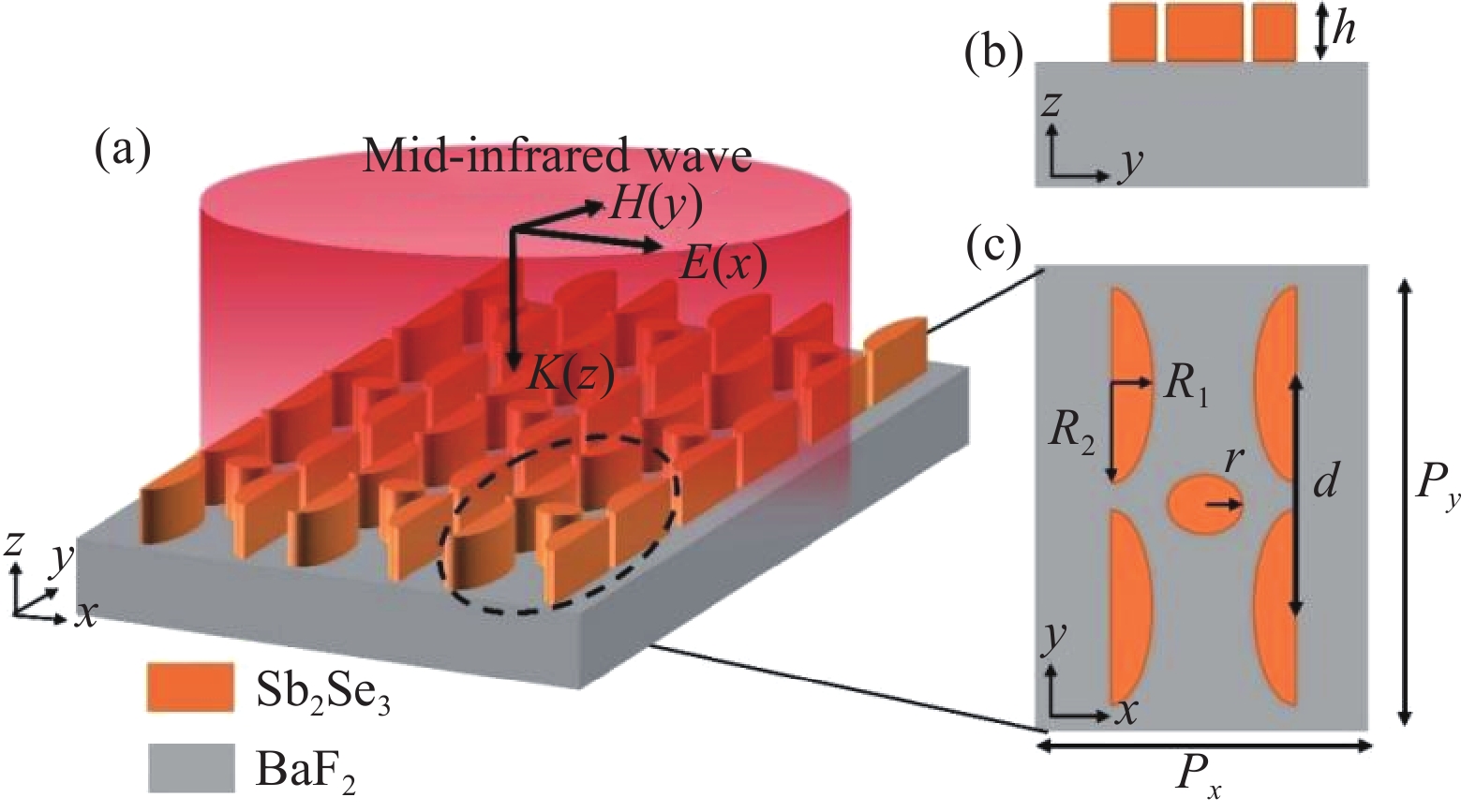 本文提出一种基于全介质超表面的高性能中红外折射率传感器,工作波长约为5.36 µm。超表面单元结构由四个对称分布的Sb2Se3半椭圆结构与一个中心Sb2Se3圆柱体周期性排列构成,以BaF2为衬底。采用时域有限差分法进行数值模拟,获得结构的反射光谱。进一步分析共振峰处的电磁场矢量分布,并探究几何参数对光谱的影响。反射光谱中观察到的法诺共振现象通过准连续域束缚态理论予以解释。通过对几何参数进行系统性扫描,重点考察在固定谐振峰强度条件下,各结构参数对器件品质因子与半高全宽的影响规律,比较不同方向调整参数时光谱线宽的响应差异。进一步通过改变背景折射率,研究了基于法诺共振的折射率传感特性。结果表明,该传感器最高灵敏度达