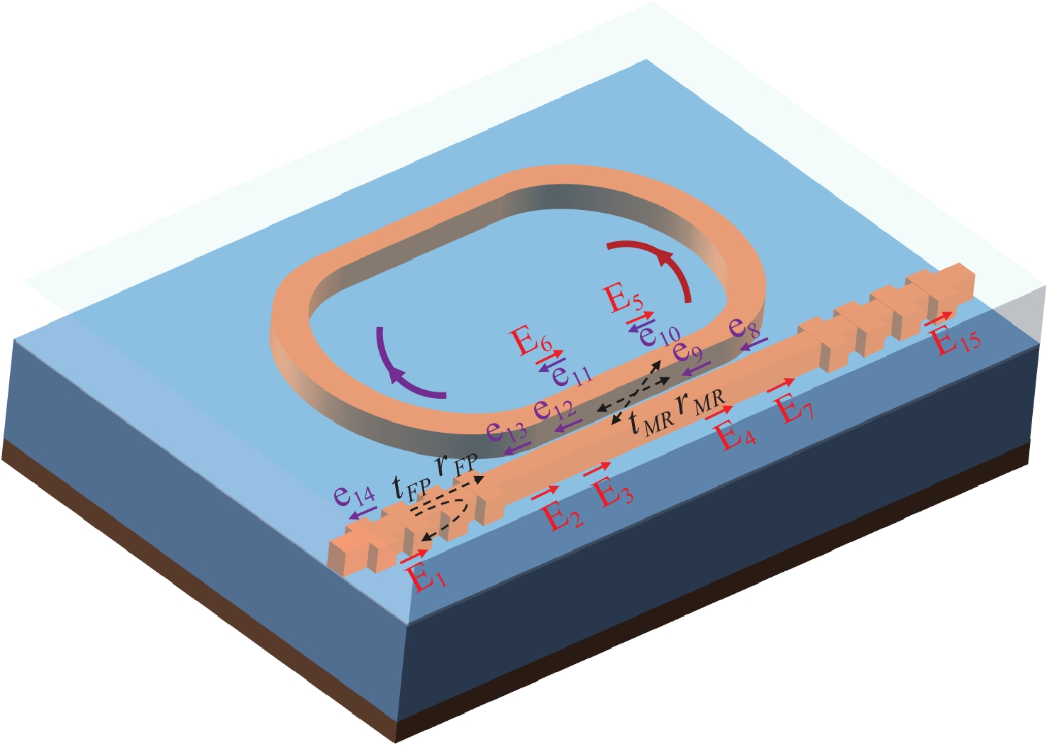 本文针对一种由微环谐振腔与法布里-珀罗腔耦合构成的集成结构,开展了传输光谱特性的理论与实验研究。该结构通过在单边耦合型微环的直波导中引入光栅反射镜形成法布里-珀罗腔,在双谐振结构中实现了新颖的多腔耦合传输谱形。成功建立系统理论模型后,分析了多腔耦合传输谱形出现的条件并进行了器件参数优化。在硅基芯片上成功制备了光栅型法布里珀罗-微环耦合谐振腔器件,首次观测到与理论预测一致的多腔耦合传输谱形,包括嵌套类电磁感应透明和双法诺共振线形。实验结果表明,在3.43 dB/cm的波导损耗条件下,电磁感应透明的中心峰可实现1.40×104的品质因子,双法诺共振的斜率最高可达到37.70 dB/nm。研究结果为集成光子耦合谐振系统的机理理解提供了新视角,并为实现高集成度、高性能的光子器件平台提供了可行技术路径,在高灵敏光学传感、窄带滤波及高速调制等领域具有重要的应用潜力。