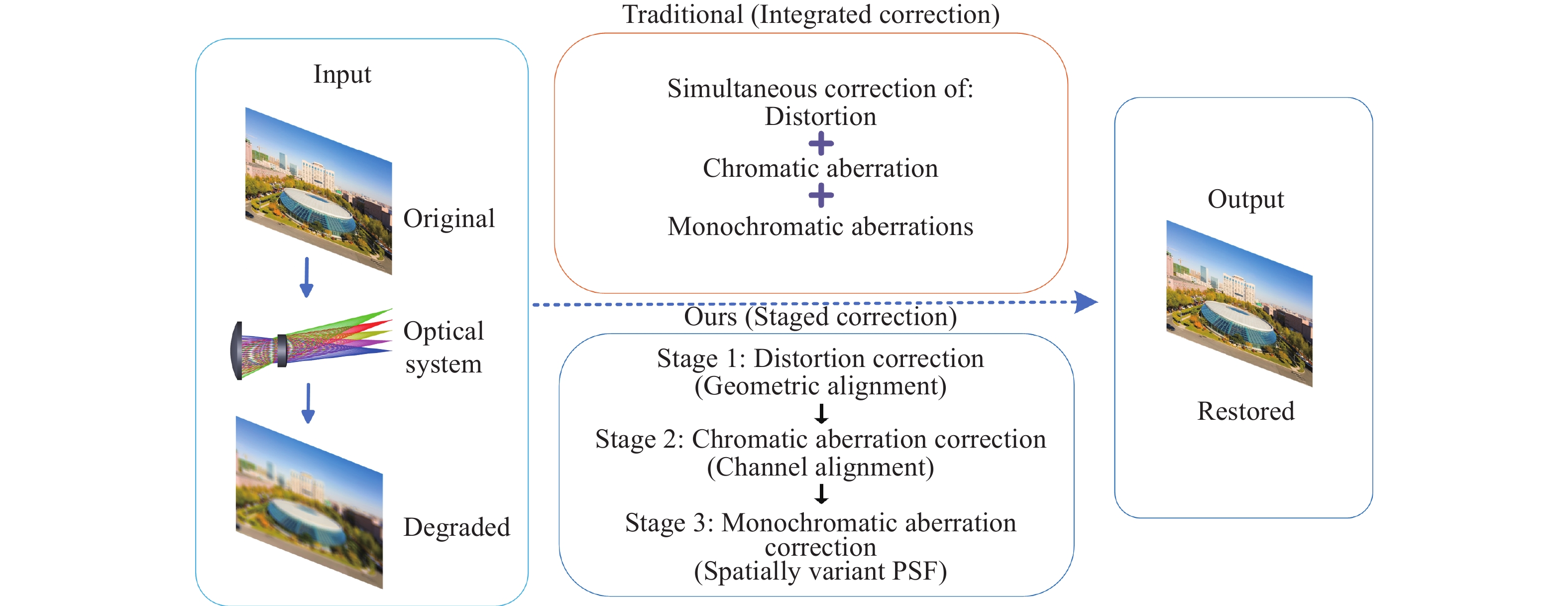 针对高性能光学系统存在的结构复杂、成本高昂的问题,本研究提出了一种面向计算校正的光学系统简化与像差校正方法。在光学设计端,构建基于像差可校正性分析的光学系统简化设计准则:优先抑制神经网络难以补偿的像差,保留易于计算校正的部分,从而在保证成像质量的前提下简化光学系统结构。在计算处理端,设计了一个包含畸变校正、色差补偿、基于物理约束点扩散函数的单色像差校正和频域增强四个模块的多模块分阶段协同校正网络,该网络由时间阶段控制器(Temporal Stage Controller,TSC)驱动,利用其动态权重调度机制进行渐进式分阶段处理,有效抑制不同像差类型相互干扰的问题。实验结果表明,简易双透镜系统经过该网络校正后的图像峰值信噪比达到31.47 dB,结构相似性达到0.95,成像质量与传统六透镜双高斯系统相当,而光学系统复杂度显著降低。消融实验验证了TSC与多模块校正架构的有效性。该研究为简化光学系统实现高质量成像提供了新的技术路径。