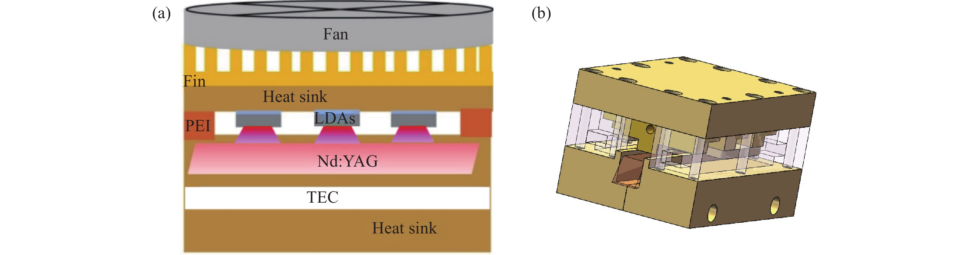 为满足特殊环境下金宝搏188软件怎么用 系统对轻量化结构与高能量脉冲输出的双重需求,本研究设计并实现了一种采用高温半导体金宝搏188软件怎么用 器阵列(Laser Diode Arrays, LDAs)侧面泵浦Zigzag Nd:YAG晶体的无水冷高能脉冲金宝搏188软件怎么用 系统。振荡光在晶体内呈现”Zigzag”路径以增加增益长度,LDAs分别对两个晶体采用轴对称式泵浦,以改善增益分布均匀性。通过隔热材料实现Nd:YAG晶体与LDAs的热隔离,并分别采用半导体制冷器(Thermoelectric Cooler, TEC)与强制风冷对Nd:YAG晶体和LDAs进行独立温控,确保热管理的稳定性与高效性。磷酸二氘钾晶体(Potassium Dideuterium Phosphate, DKDP)作为电光调Q晶体。在不使用水冷、重复频率为100 Hz(占空比为2.5%)的条件下,实现了129.2 mJ的脉冲金宝搏188软件怎么用 输出,脉冲宽度为9.0 ns,对应的光-光转换效率为9.6%,斜效率为13.1%,输出能量稳定性优于2.26%。并在150 Hz重复频率下取得了87.6 mJ的能量输出。该金宝搏188软件怎么用 系统为金宝搏188软件怎么用 测距、金宝搏188软件怎么用 照射等领域提供了一种环境适应性强、结构紧凑的新型光源解决方案。