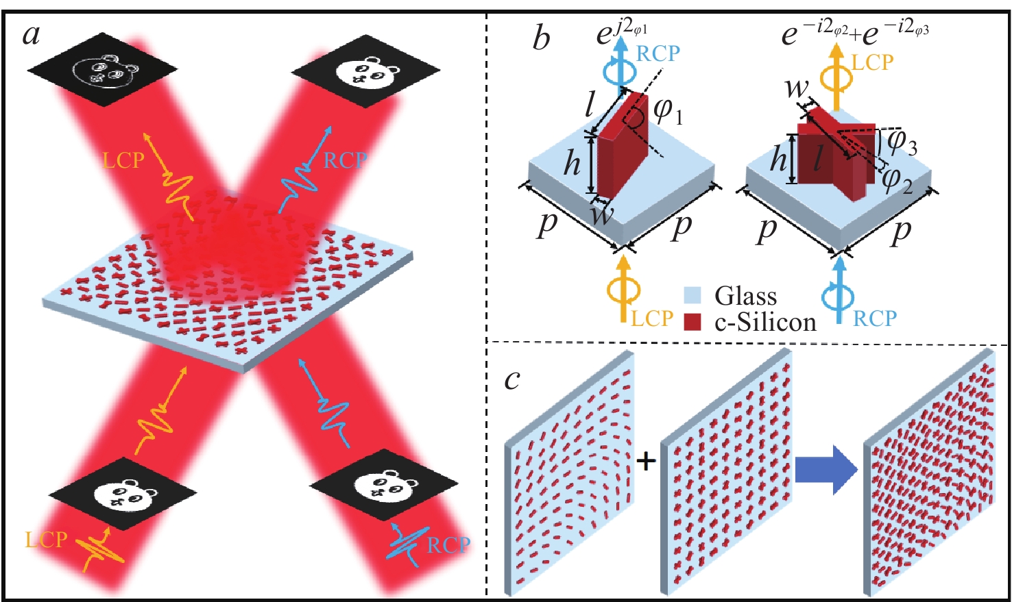 光学图像处理具有运算速度快、可并行操作等优势。本研究设计了一种单层超表面结构,用于实现图像光学成像与边缘检测功能。该双功能图像处理无需借助4F系统,仅通过改变入射圆偏振光的手性即可实现切换。所设计的超表面由硅纳米柱构成,优化后的硅纳米柱可等效为透过率达87%的半波片。仿真与实验结果验证了超表面的性能表现。这种集成式光学超表面不仅简化了图像处理系统,更为超表面在并行图像处理与光学集成领域的应用开辟了新路径。