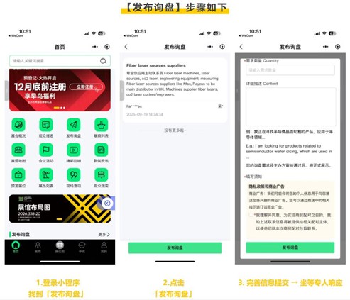 1. 扫码进入慕尼黑上海光博会小程序XMATCH计划活动页面,点击发布采购询盘,提交您的采购需求